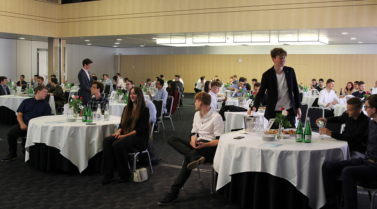 So wie der Live-Stream eine Premiere war, war es dieses Jahr auch das erste Mal, dass alle Lehrabgänger/innen trotz Militär anwesend sein konnten. Durch die limitierte Anzahl an Anwesenden liess der Saal eine Kabarett-Bestuhlung zu, was wiederum einen Apéro im kleinem Rahmen an den Tischen ermöglichte. Daniel Knecht, Standortleiter von Zürich und Rapperswil, begrüsste alle mit einem überglücklichen Prosit und eröffnete die Feier. Die Lehrabgänger Ivana Kurobasa und Max Ganz führten ihre Kolleginnen und Kollegen gekonnt mit einigen Lachern zurück in die Lehrzeit und frischten so viele schöne Erinnerungen auf. Der Geschäftsführer Christian Villiger gratulierte und überbrachte ebenfalls die besten Grüsse des Vorstandes.