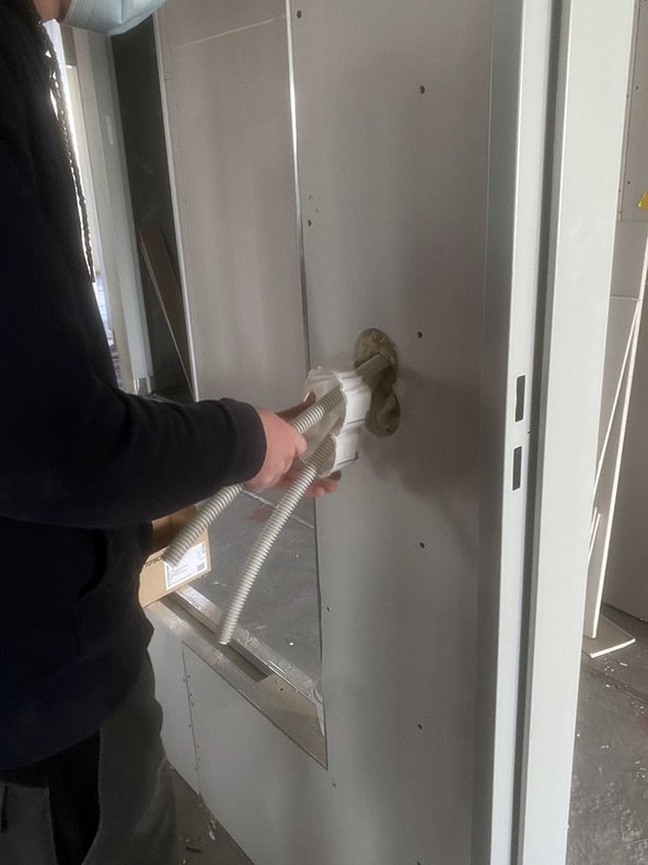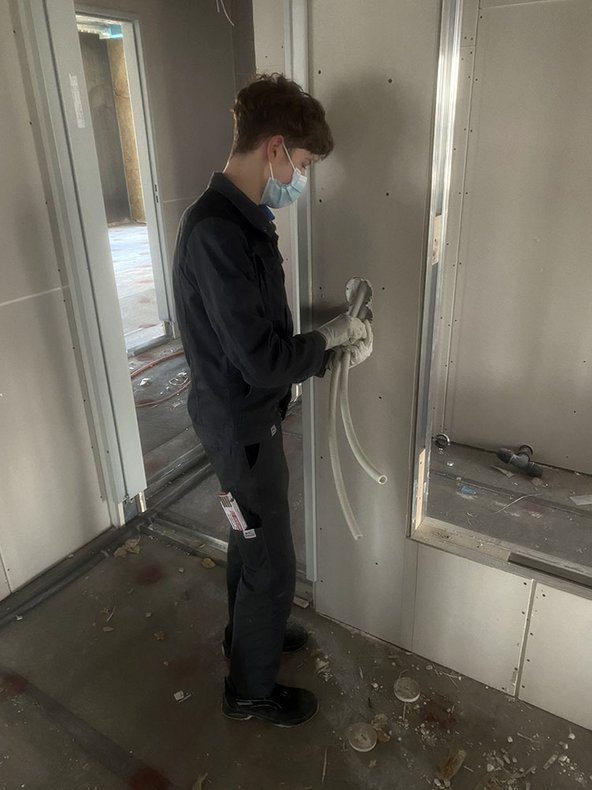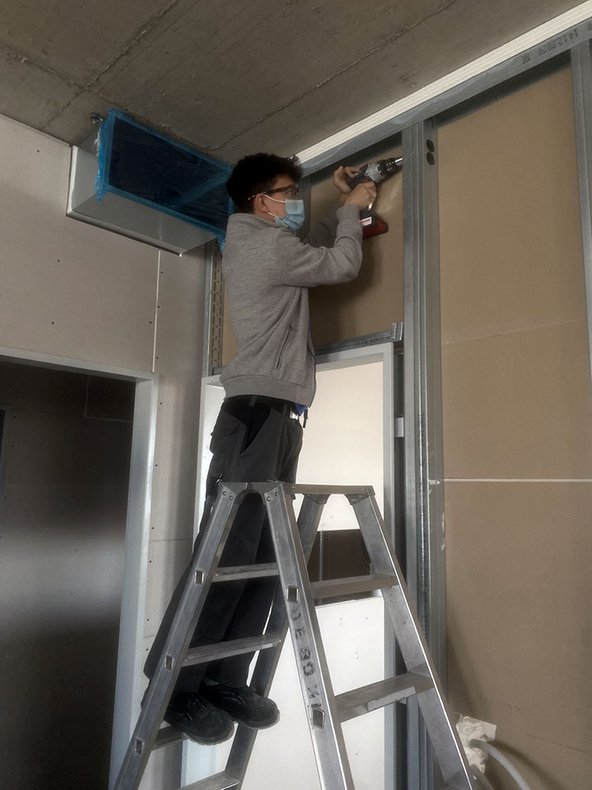Während einige Lernende die Kabeltrassen an den Decken befestigten, stellten andere Wände auf und bohrten Zugänge für Kabelrohre und Steckdosen. Unsere jungen Arbeitskollegen erhalten damit einen sehr guten Einblick in den Beruf des Elektroinstallateurs. Angeleitet von Fachleuten lernen sie so die praktischen Tätigkeiten dieses Berufsstandes kennen und tragen zum raschen Fortschreiten des Ausbaus bei.