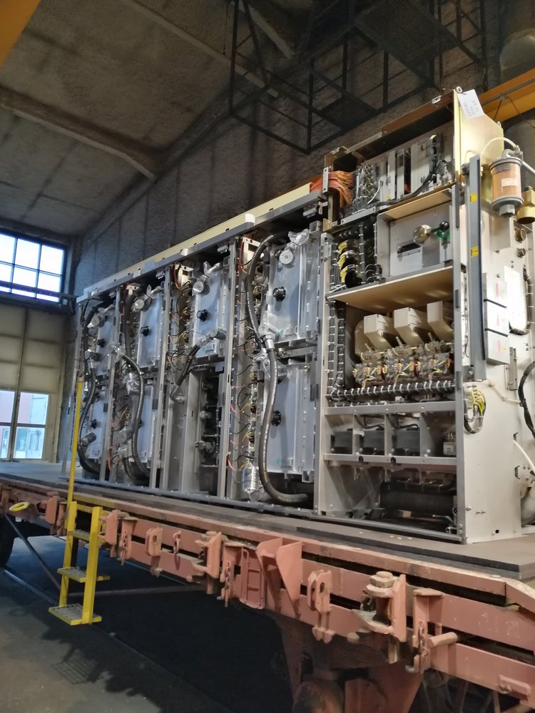 Es dauerte fast vier Tagen, bis wir den ersten Stromrichter fertig revidieren konnten. Nachdem wir alles gereinigt, ersetzt, kontrolliert und jedes Käbelchen richtig montiert hatten, war es an der Zeit, Öl in den Stromrichter fliessen zu lassen. Das Öl wird durch Filtern gepumpt, damit das Innenleben des Stromrichters schön sauber ist. Während dem Zirkulieren des Kühlöls steigt dessen Temperatur auf ca. 60 Grad Celsius. Da die übrigen Bestandteile des Stromrichters sehr heiss werden, ist das vermeintlich ebenfalls warme Kühlöl trotzdem abkühlend. Es war auch sehr faszinierend mitzuerleben, wie das Endprodukt in der Lokomotive eingebaut wurde.